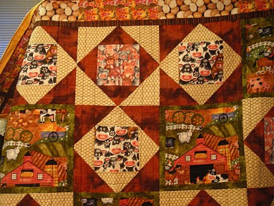 I've also made four quilts (completed 3 7/8). I only have pictures of two. I have also made two baby quilts. The one for baby WooWoo was made from scraps of the farm quilt below. Oddly enough, the farm quilt is the first one started, and it is the one that still isn't finished. I still have to bind the quilt.